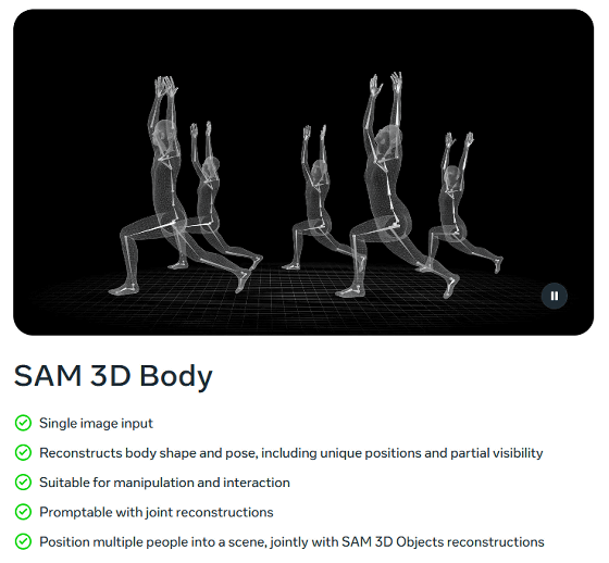 SAM 3D Bodyは画像内に存在する人間の体形とポーズを認識して3Dモデル化できるAIです。