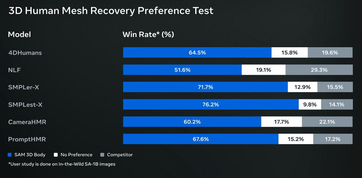 SAM 3D Bodyと複数の競合AIで3Dモデルを生成し、どちらが高品質かを人間に判断させた結果が以下。青色が「SAM 3D Bodyの方が高品質」、白色が「引き分け」、灰色が「競合AIの方が高品質」と判断された割合を示しています。SAM 3D Bodyは比較対象のすべてのAIに対して勝利を収めています。
