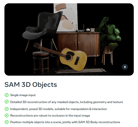 1枚の写真から目的の人間や物体だけを切り抜いて3Dモデル化できるAI「SAM 3D Body」&「SAM 3D Objects」をMetaが公開