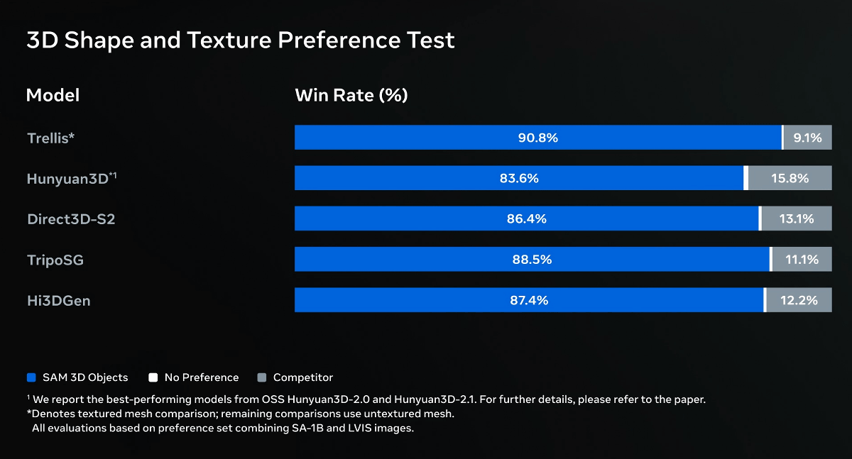 SAM 3D Objectsと競合AIの性能を人間に評価させた結果が以下。SAM 3D Objectsはすべての競合AIに対して8割以上の勝率を記録しました。