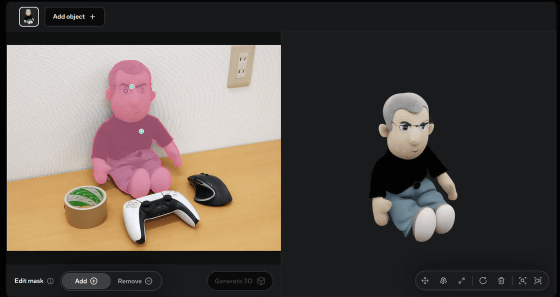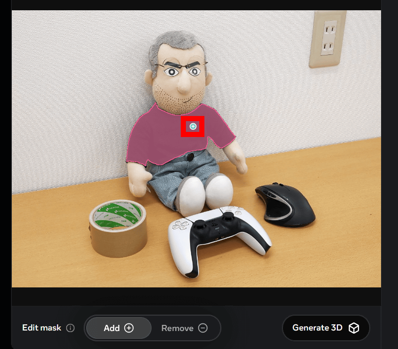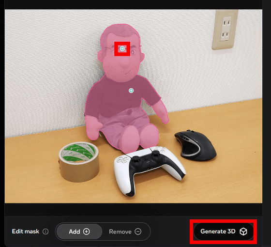 物体の他の部分もクリックして物体全体が塗りつぶされるようにします。今回は人形の頭部を追加でクリックしたところ、人形全体が塗りつぶされました。この状態で右下の「Generate 3D」をクリックすると3Dモデルを生成できます。