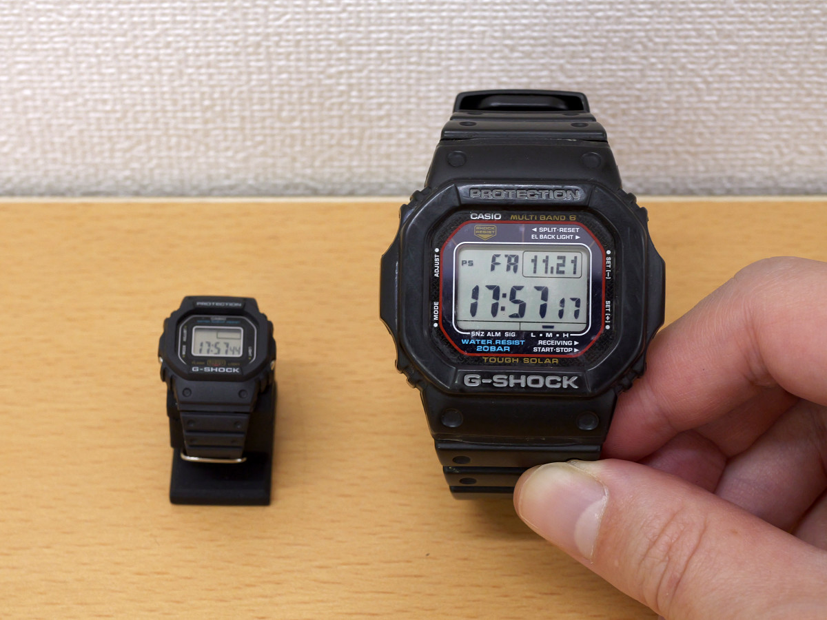 5600シリーズのG-SHOCKと並べると非常に小さいことがよく分かります。ケースサイズは23.4mm×20mm×7.5mmです。