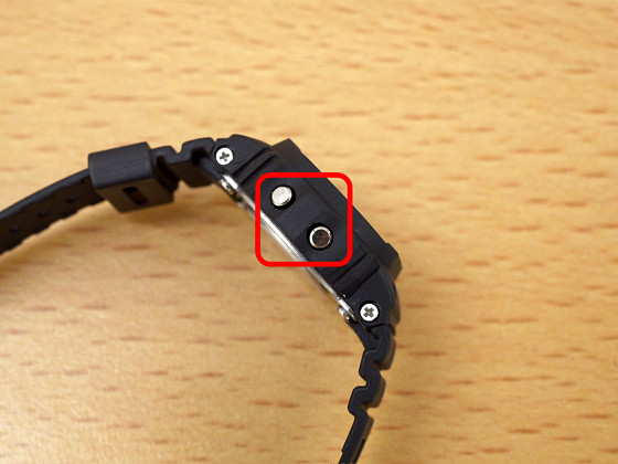 文字盤から見て左側の側面には銀色のボタンを2個搭載。