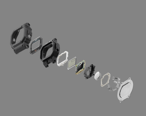 以下は、公式サイトに掲載されている構造イメージ画像です。通常のG-SHOCKの10分の1まで小型化しつつ、気密構造を多用するG-SHOCKならではの耐衝撃構造は維持。さらに、20気圧の防水性能も備えています。