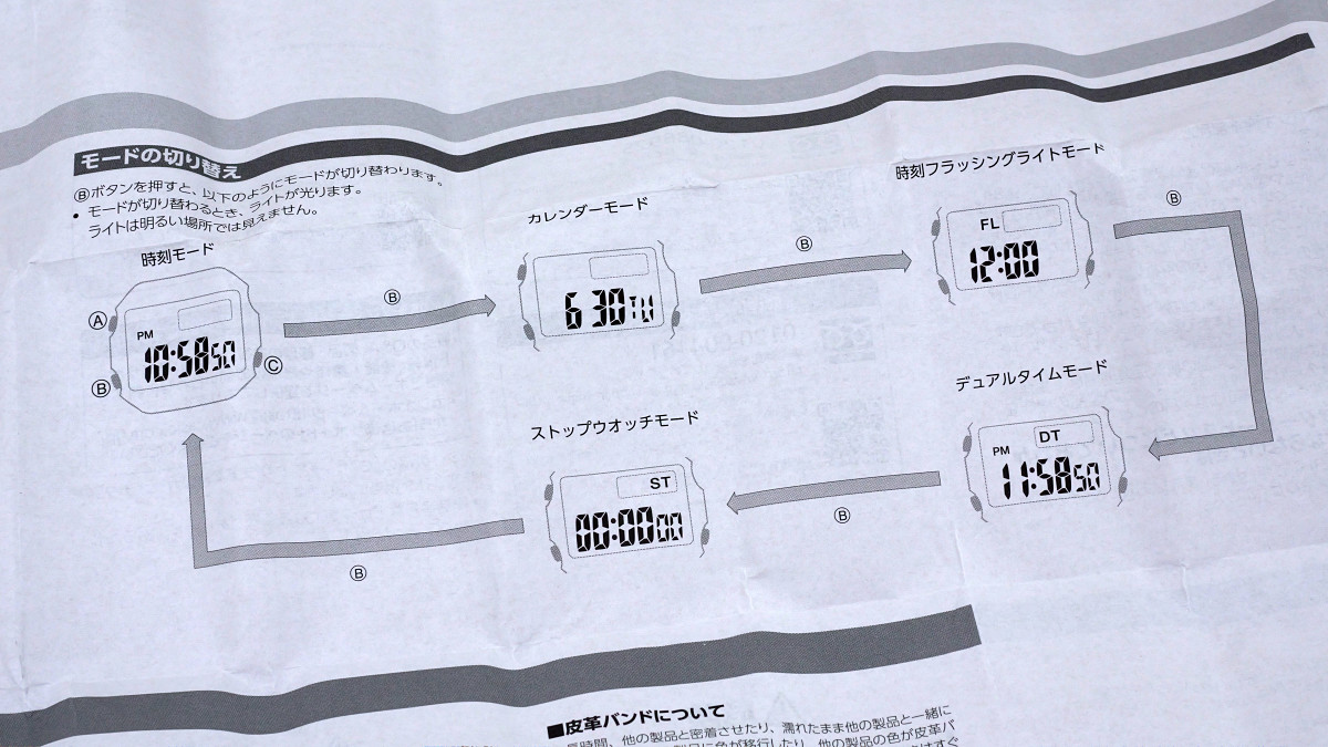 ボタンは飾りではなく、実際にモード変更に使うことが可能。DWN-5600は「時刻モード」「カレンダーモード」「時刻フラッシングライトモード」「デュアルタイムモード」「ストップウオッチモード」を備えています。