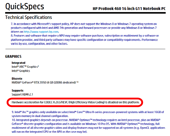さらに、2025年11月6日には「社内のHP製PCでH.265のハードウェアデコーダーが無効化されていた」という報告が寄せられました。報告者によると、当該PCでは「ウェブブラウザでH.265のコンテンツにアクセスすると、読み込みが終わらない」「ローカルの動画再生アプリではH.265コンテンツを再生できるものの、ソフトウェアデコーダーによって再生される」「ビデオ会議アプリの背景ぼかし機能が使えない」「(H.265関連機能の利用中に)システム全体のパフォーマンスが著しく悪化する」といった問題が確認されたとのこと。また、報告者は「(PDFファイル)HP ProBook 460 G11」「(PDFファイル)HP ProBook 465 G11」「(PDFファイル)EliteBook 665 G11」のスペック表にH.265に関する注意書きが記されていたことも発見しています。