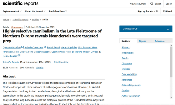ネアンデルタール人は約40万年前に地上へ現れたヒト属の一種で、現生人類(ホモ・サピエンス)と長らく共存していたことや、複雑な文化を持っていたことなどが知られています。そんなネアンデルタール人が、「よそ者の女性や子ども」を共食いしていた可能性があるとの論文が、学術誌のScientific Reportsに掲載されました。