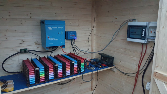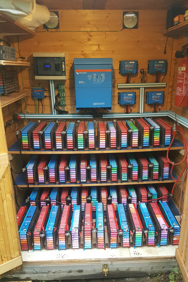 Glubux氏の蓄電池システムは、屋根に取り付けられた1.4kWのソーラーパネルとバッテリー、充電コントローラーと24Vから12Vへの変圧器、インバーターで構成されています。バッテリーパックはノートPCのバッテリーセルで構成されており、2016年時点で約650個のバッテリーセルが使われていました。