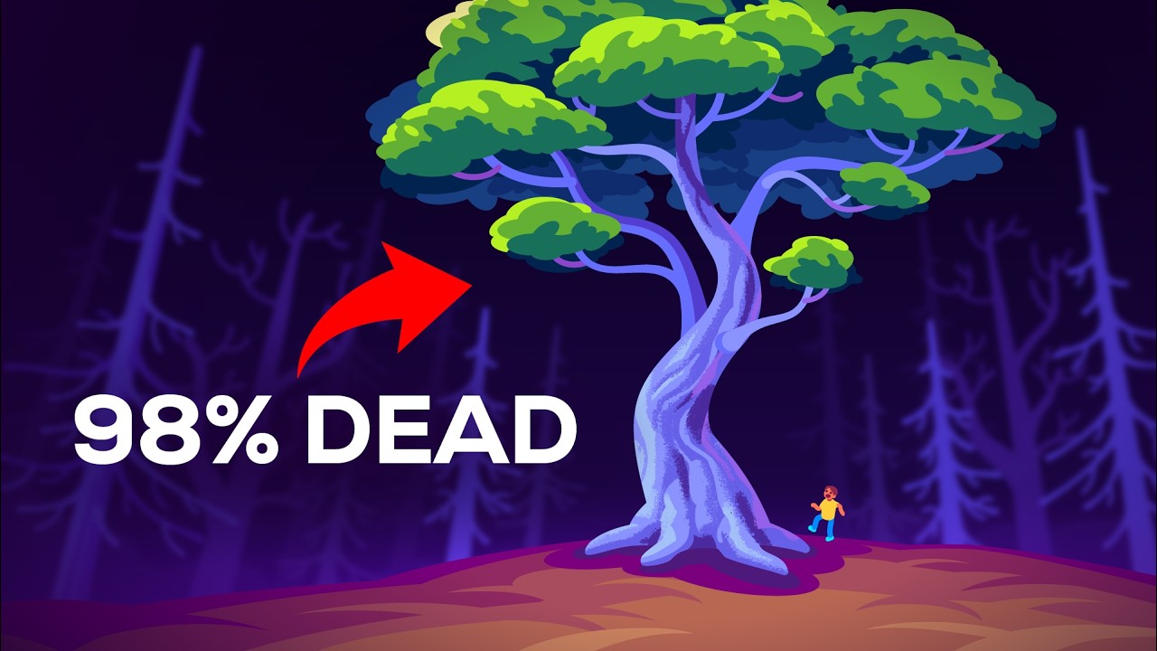 木のネットワークを形成している細胞のほとんどは死んで管になった細胞であり、木の生きている部分は、分厚い死骸の外側にわずか数ミリだけ存在しています。Kurzgesagtは「樹木の大部分は死んでいます。しかし干ばつや病気、天災、または人間の手によって折られない限り、ほとんど死んでいるからこそ、木は潜在的に不死になっています」と表現しています。