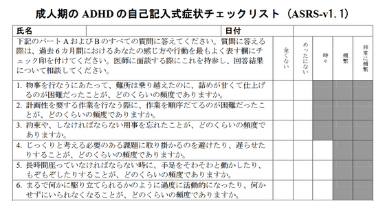 自身にADHDの特性があるかどうかを確かめられるテスト「ASRS v1-1」が、世界保健機関と複数の研究者らからなるグループにより作成・公開されています。