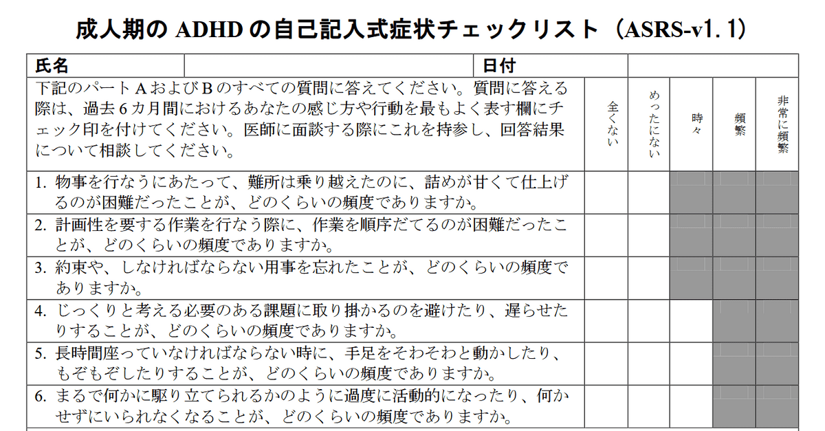 1分でできるセルフADHDテスト「ASRS v1-1」