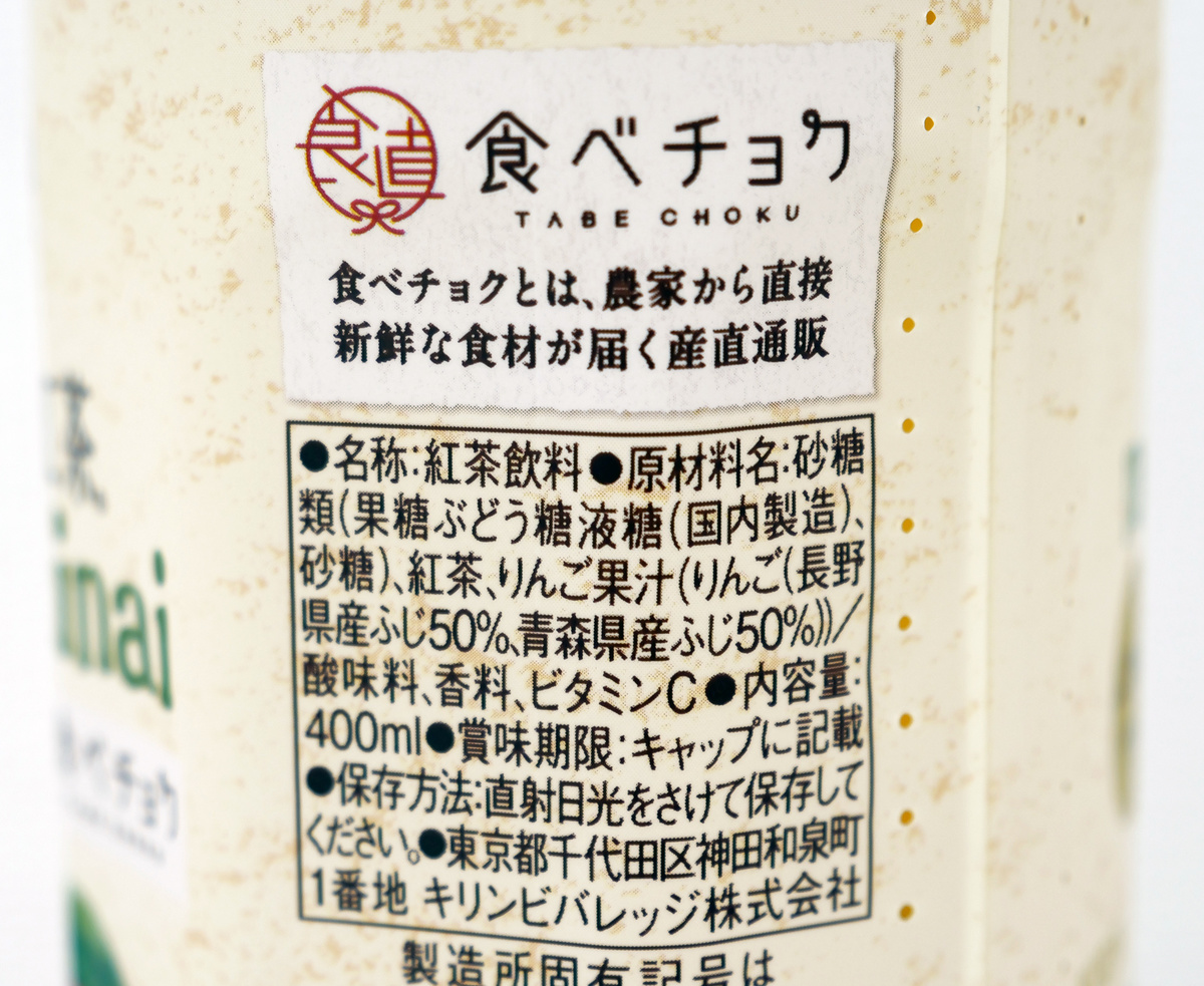 名称は紅茶飲料で、原材料名には「りんご果汁」として長野県産ふじ50%、青森県産ふじ50%と記載されています。果汁は0.1%。