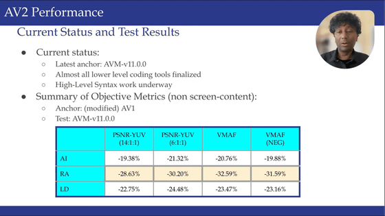 AV2は記事作成時点で、数学的な画質評価指標であるPSNRにおいて約28%から30%、より人間の見た目に近い評価指標であるVMAFにおいては約32.6%のデータ削減を達成しているとMukerjee氏は述べています。これは、AV2が当初の目標通り、AV1から大幅な性能向上を実現していることを客観的な数値として裏付けるものです。