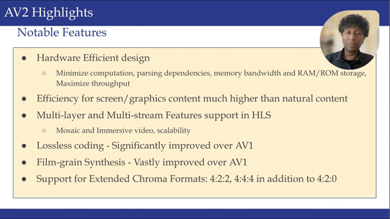 さらに、複数の映像を1つのストリームとして扱うマルチストリーム機能や、没入型映像への対応を見据えた構文が盛り込まれており、単なる圧縮率の向上だけでなく、将来的な多様なユースケースを支える基盤技術として進化を遂げているとMukerjee氏は報告しました。