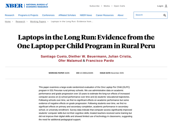 開発途上国では子どもたちに充実した教育を与えるべく、技術へのアクセスを向上させる取り組みが試みられてきました。その中の1つが、1人に1台のノートPCを与える「One Laptop per Child(OLPC)」プログラムです。ペルー・カトリカ大学のサンティアゴ・クエト氏らは、ペルーでのOLPCプログラムの10年分のデータを検証し、報告しています。