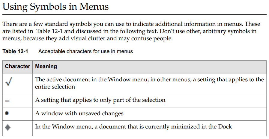 ちなみに、AppleがUIに関するルールを定めた「Apple Human Interface Guidelines」では、2005年から第12章「メニュー」内には「Using Symbols in Menus(メニューでのシンボル使用)」という見出しが用意されていて、「メニューではいくつか標準的なシンボルを用いて、機能の追加説明をしてもよいが、その他の任意のシンボルは、見た目をごちゃつかせユーザーを混乱させるので使わないこと」と定められていました。このルールに従うと、使える記号はわずかに4つ。