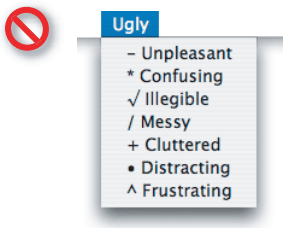 以下はガイドラインで示された「やってはいけない例」。ニールセン氏はその見た目を「macOS Tahoeのメニューです」と述べています。