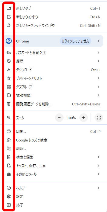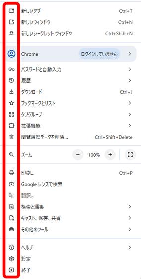 Google Chromeの場合、メニューを開くとこんな感じで「新しいタブ」から「終了」まで、メニュー項目の左側にアイコンが表示されています。