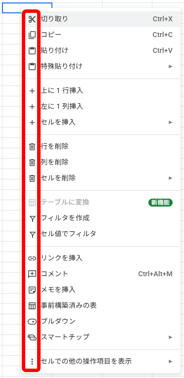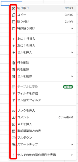 コンテキストメニューでも同様で、Googleスプレッドシートの場合はこんな感じ。「貼り付け」と「特殊貼り付け」など、複数の同じアイコンが使われているところもあります。