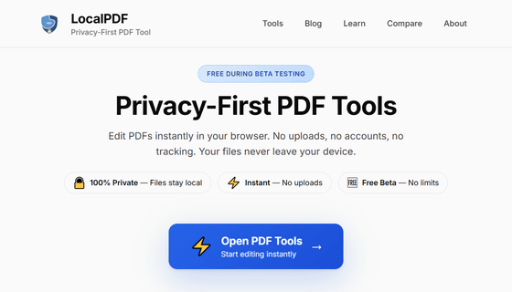 LocalPDFを利用するには、上記URLにアクセスしてページ上部にある「Open PDF Tools」をクリックします。