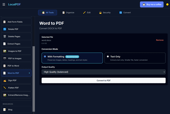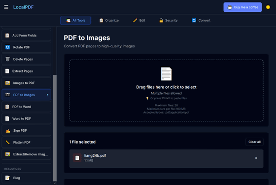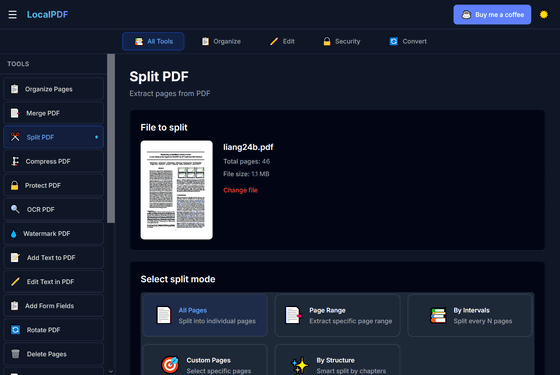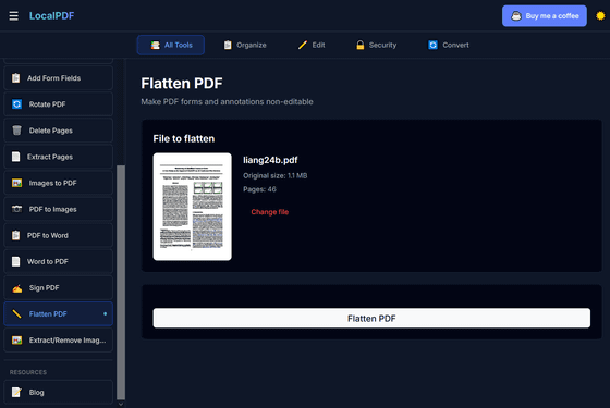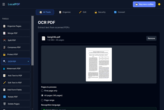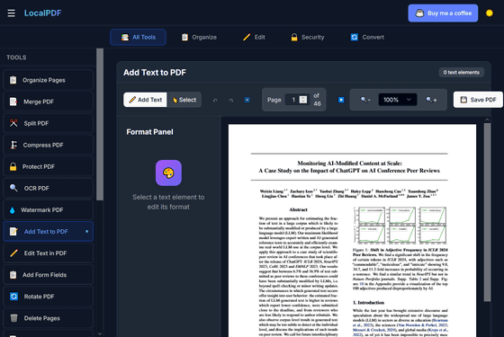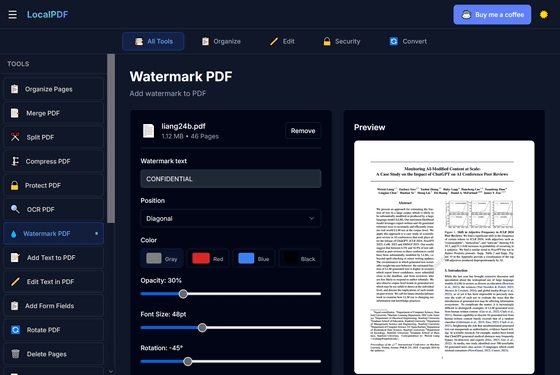アカウント登録なし、インストール不要でありながら、編集・署名・別ファイル形式への変換・透かしの追加・光学文字認識(OCR)などのさまざまな編集機能を完全無料で使えるPDFエディターが「LocalPDF」です。既存のPDFエディターはオンライン上にファイルをアップロードする必要があるためプライバシーが完全に守られているとは言い難いものになっていますが、LocalPDFはローカルにあるファイルを読み込んでネット上にアップすることなく作業できるため、プライバシーが100%守られているという点でも特異です。