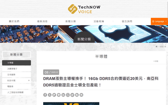 DRAM漲勢主導權換手! 16Gb DDR5合約價逼近20美元,南亞科DDR5過驗證且金士頓全包產能! - 新聞分類 - TechNOW Voice
