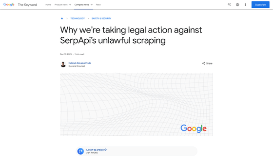 「検索結果をスクレイピングして再販することはGoogleの規約や法律に違反している」として、Googleがテック企業のSerpApiを訴えました。