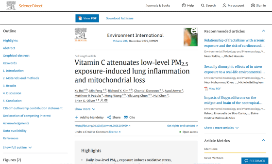 研究チームはPM2.5に暴露したオスのマウスにビタミンC入りの水または生理食塩水を与え、安楽死させた後に肺組織を分析して両者を比較しました。また、培養したヒトの肺上皮細胞をビタミンCで処理した後にPM2.5へ暴露し、細胞生存率や炎症反応を調査しました。