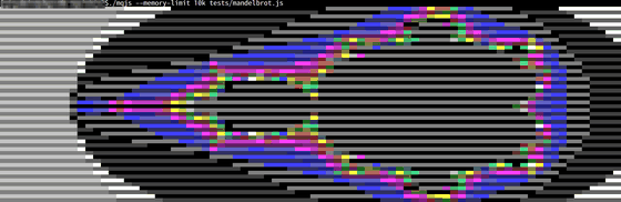 実行ファイル「mqjs」が作成されました。まずは使用メモリを10KBに限定しマンデルブロ集合を計算し作図するテスト用スクリプト「./mqjs --memory-limit 10k tests/mandelbrot.js」を実行すると簡易のフラクタル図が表示されました。