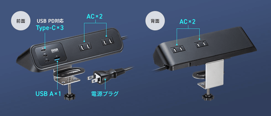 机の端っこに固定して片手でケーブルの抜き差しを可能とするクランプ固定式電源タップ「TAP-B114UC-2BK(ブラック)」と「TAP-B114UC-2W(ホワイト)」が2026年1月16日に登場しました。前面と背面に2個ずつのAC差し込み口を搭載しているほか、USB PD対応のUSB Type-Cポートも3個搭載しています。USB PDの出力は最大65Wです。