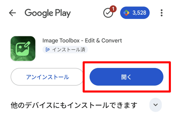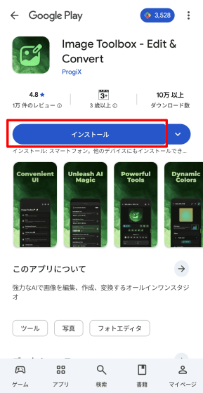今回はGoogle PlayからインストールするのでGoogle Playのバナーをタップし、移動先のImage Toolboxのページで「インストール」ボタンをタップします。