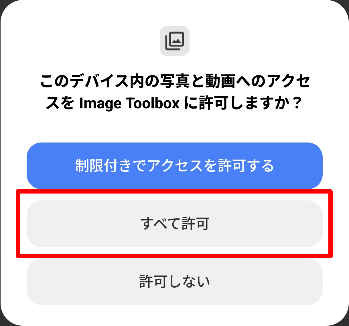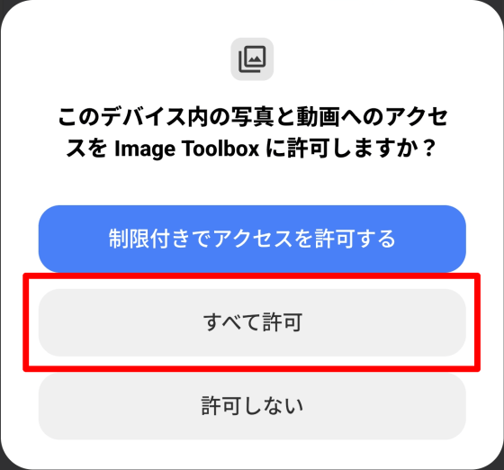 続いて「このデバイス内の写真と動画へのアクセスを Image Toolbox に許可しますか?」というポップアップが表示されますが、アプリの用途を考慮するとアクセス制限はない方がいいので「すべて許可」ボタンをタップします。