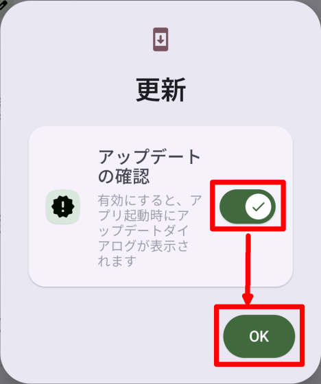「更新」ポップアップについては、「アップデートの確認」がオンになっていることを確認し「OK」ボタンをタップします。