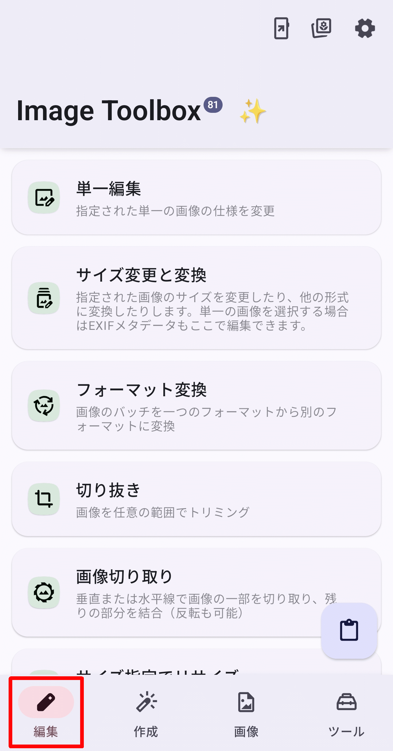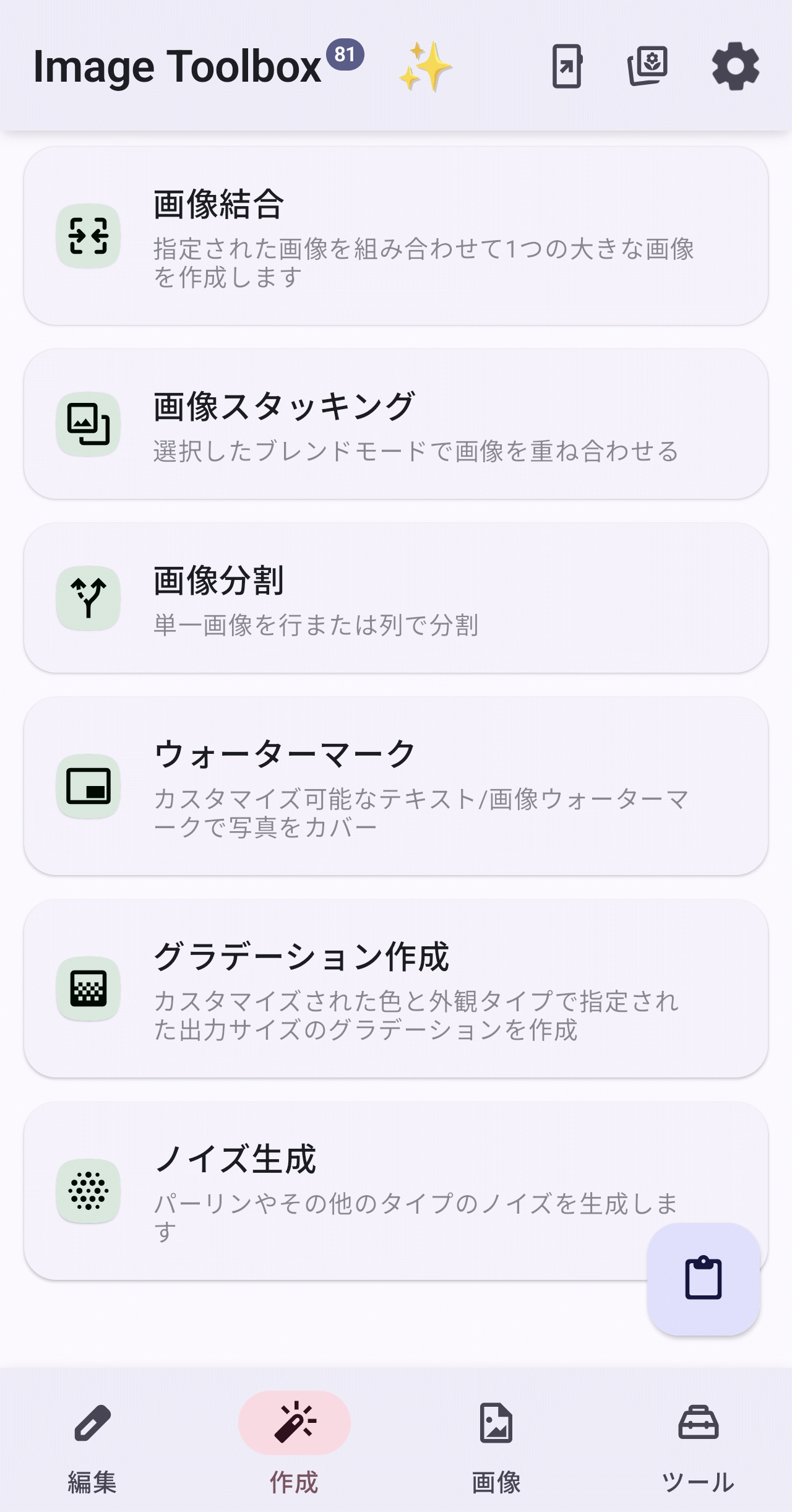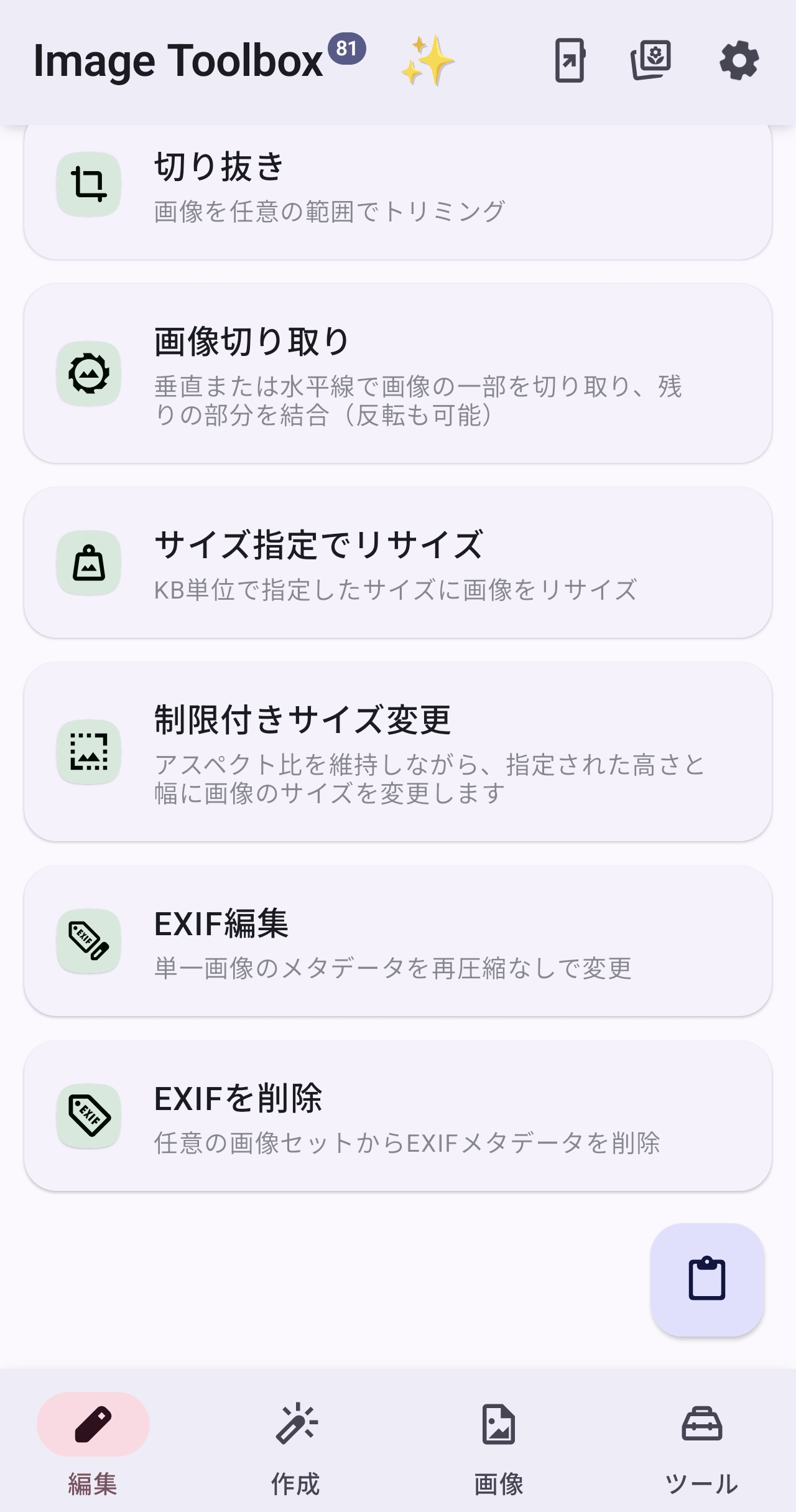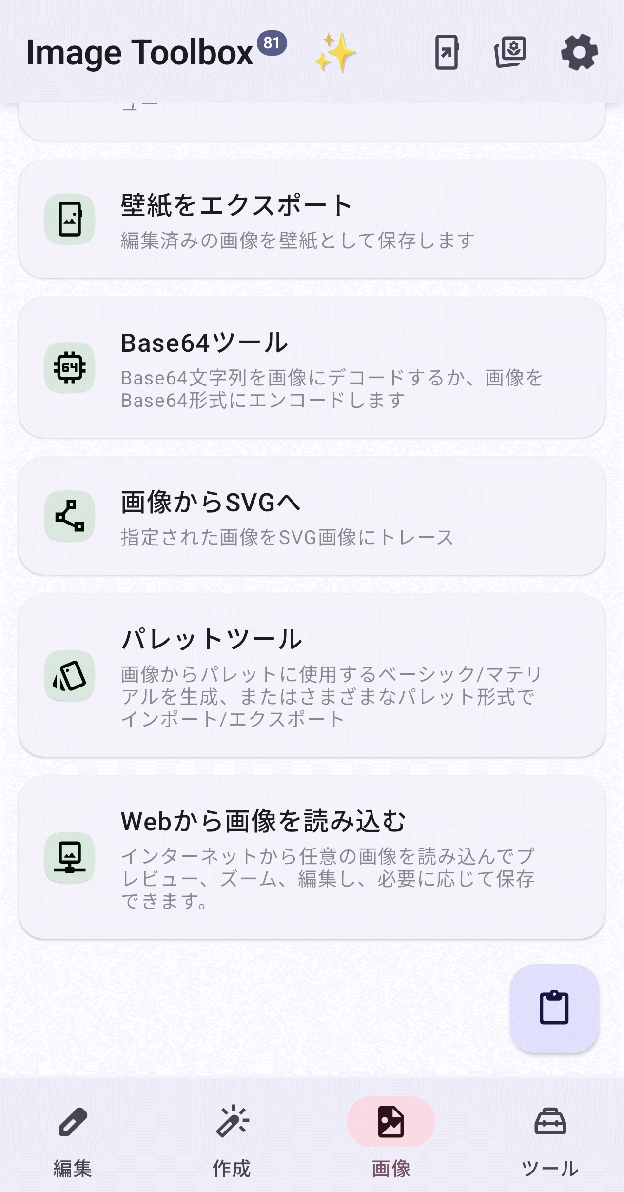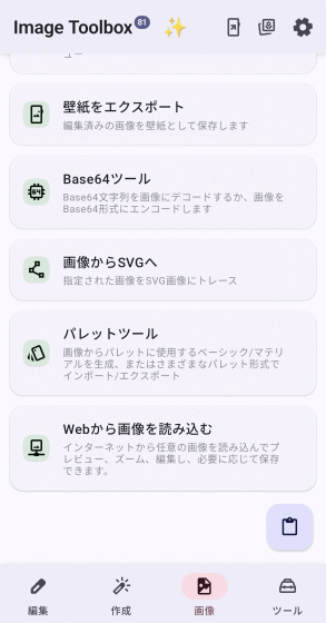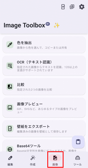 ホーム画面上で「画像」タブを選択した状態が以下。「OCR(テキスト認識)」「比較」「画像からSVGへ」といったPCソフトに引けを取らない興味深いツールがみられます。スマホツールとしては「壁紙をエクスポート」機能が役立ちそう。