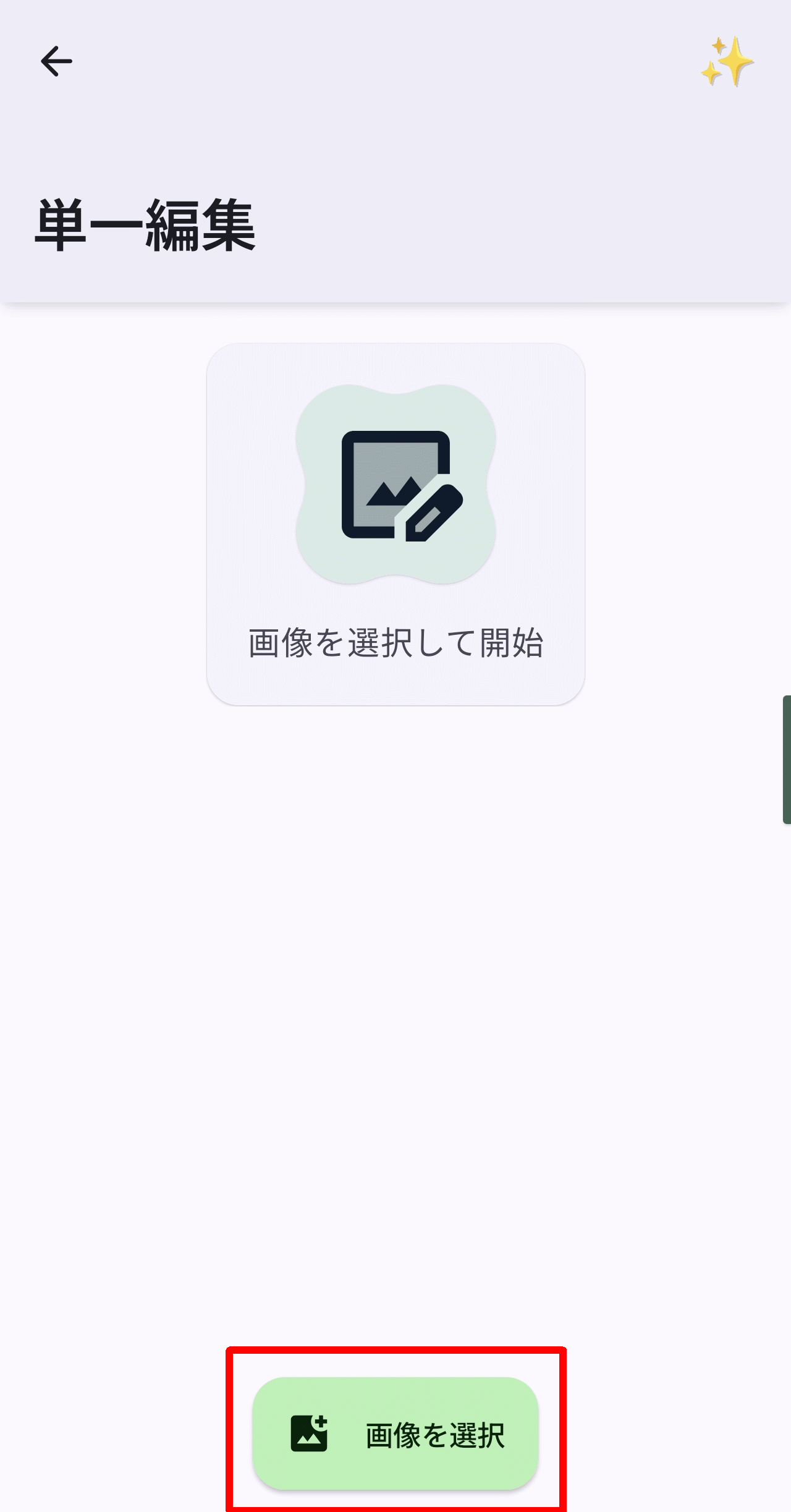 「単一編集」を選択して移動する画面で「画像を選択」ボタンをタップします。