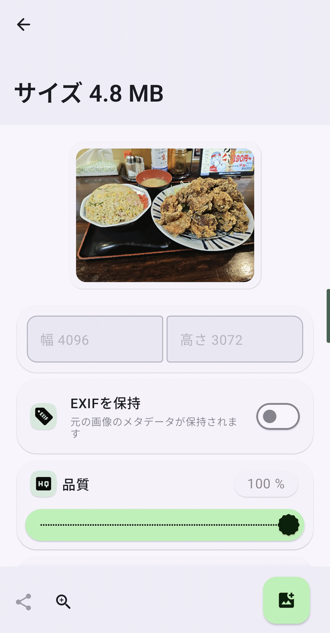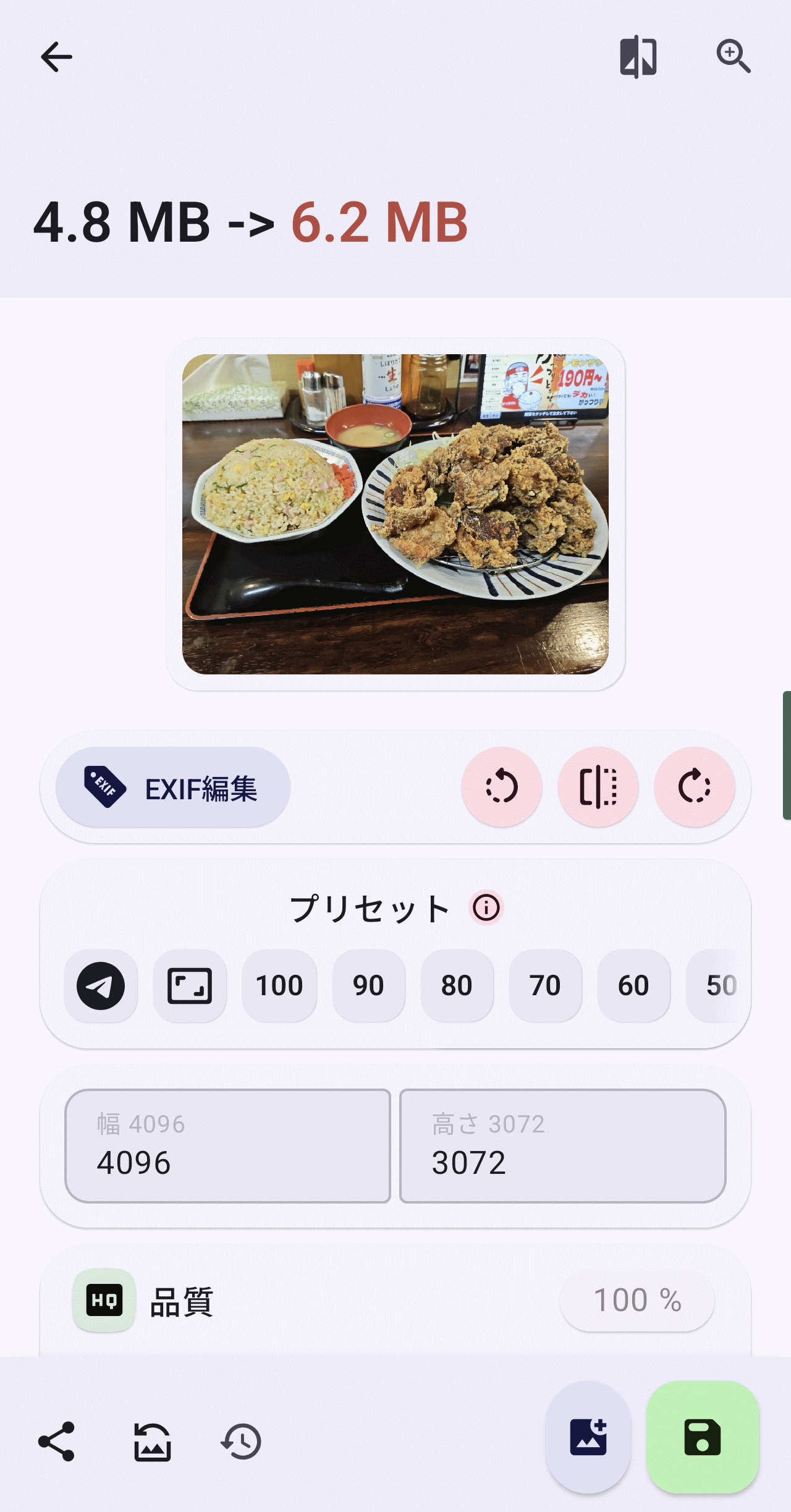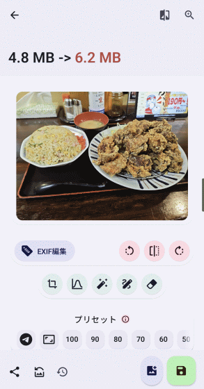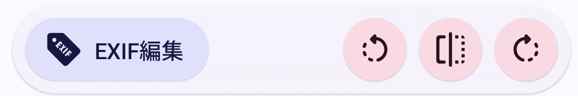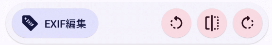 画像直下に配置された4つのアイコンはタップすると左から「EXIF編集」「反時計回り90度回転」「左右反転」「時計回り90度回転」を実行します。