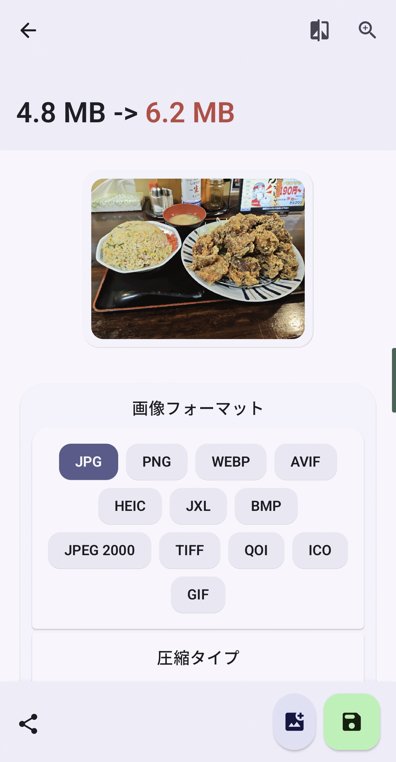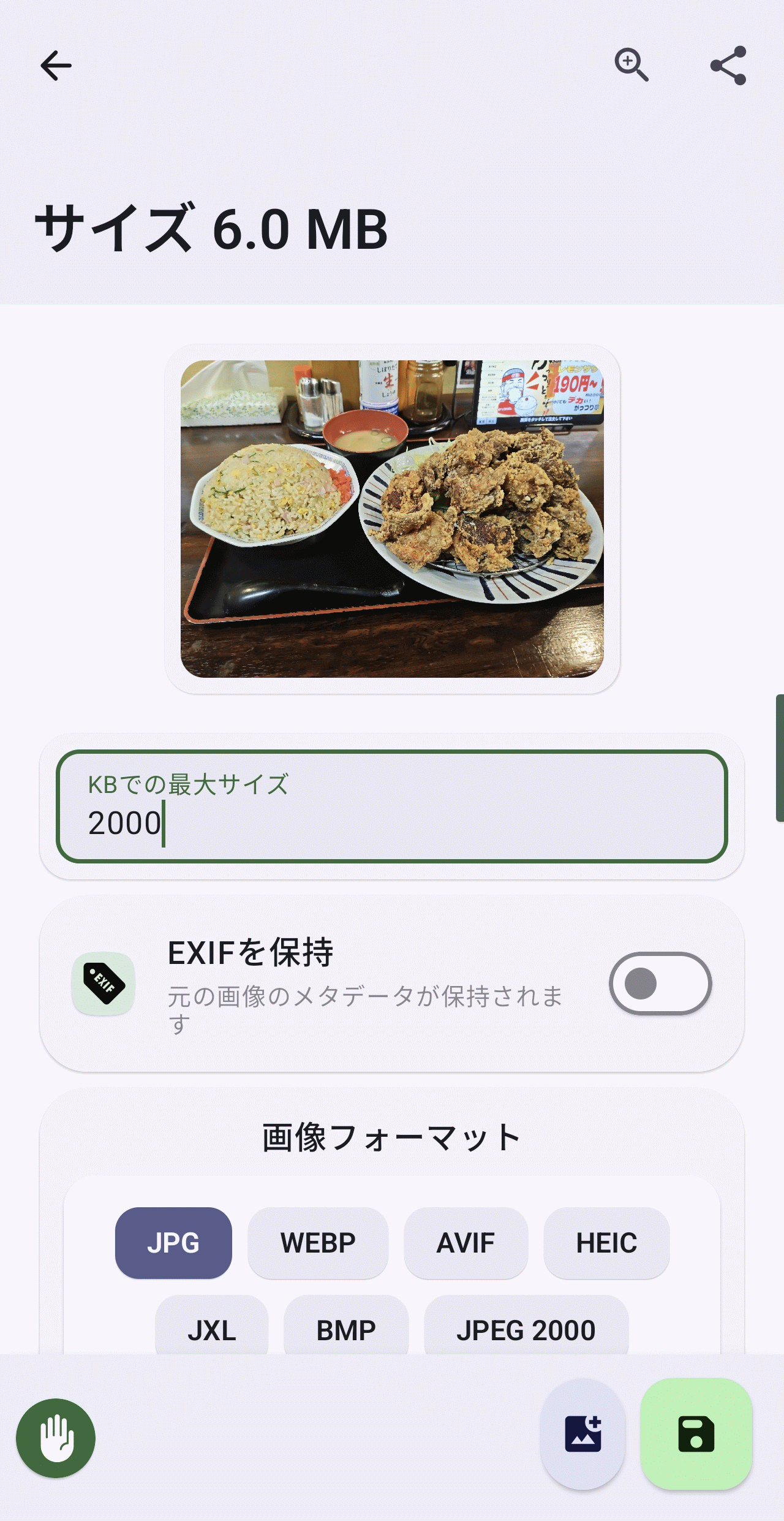 「フォーマット変換」を選択して画像を選択すると以下の画面に。