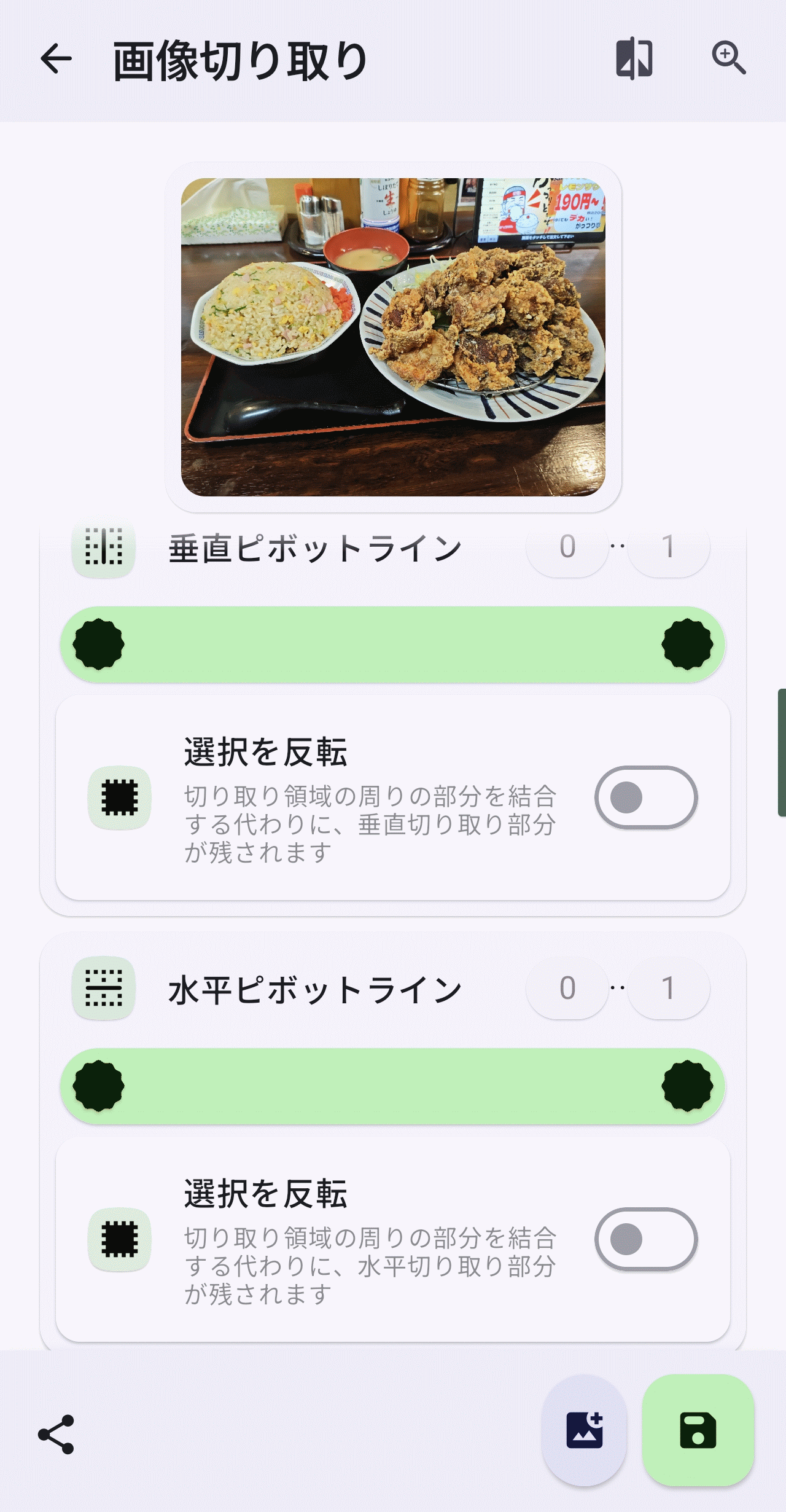 「画像切り取り」を選択して画像を選択すると以下の画面が表示され垂直ピボットラインと水平ピボットラインを指定できます。量ピボットラインについて選択を反転することもできます。