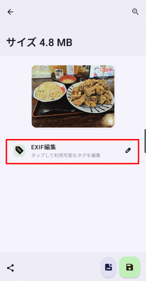 「EXIF編集」を選択して画像を選択すると以下の画面となり、中央の「EXIF編集」ボタンをタップするとポップアップが表示されます。