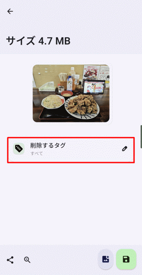 「EXIFを削除」を選択して画像を選択すると以下の画面となり、中央の「削除するタグ」ボタンをタップするとポップアップが表示されます。