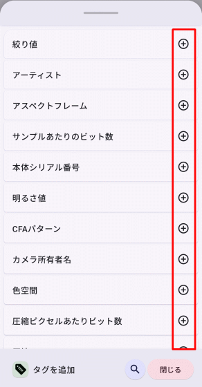 ポップアップでは削除するEXIFタグを指定できます。特定のEXIFタグを削除対象から外すにはEXIFタグ名の右側にある「+」アイコンをタップし「-」アイコンに変更すればよく、再度タップすると「+」アイコンに戻り削除対象となります。