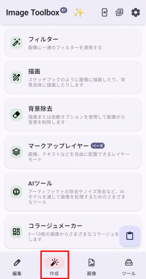ホーム画面上で「作成」タブを選択した状態は以下の通り。「フィルター」「AIツール」「ウォーターマーク」といった強力な機能があります。記事作成時点ではベータ版機能となっていますが画像上に文字や別画像をレイヤーとして配置できる「マークアップレイヤー」も使い勝手がよさそうです。