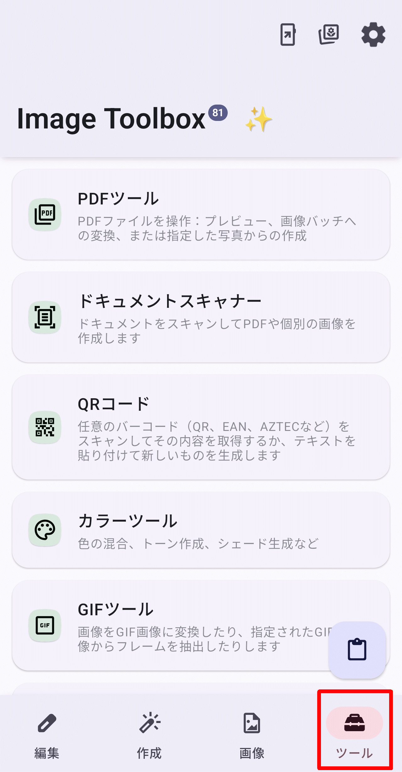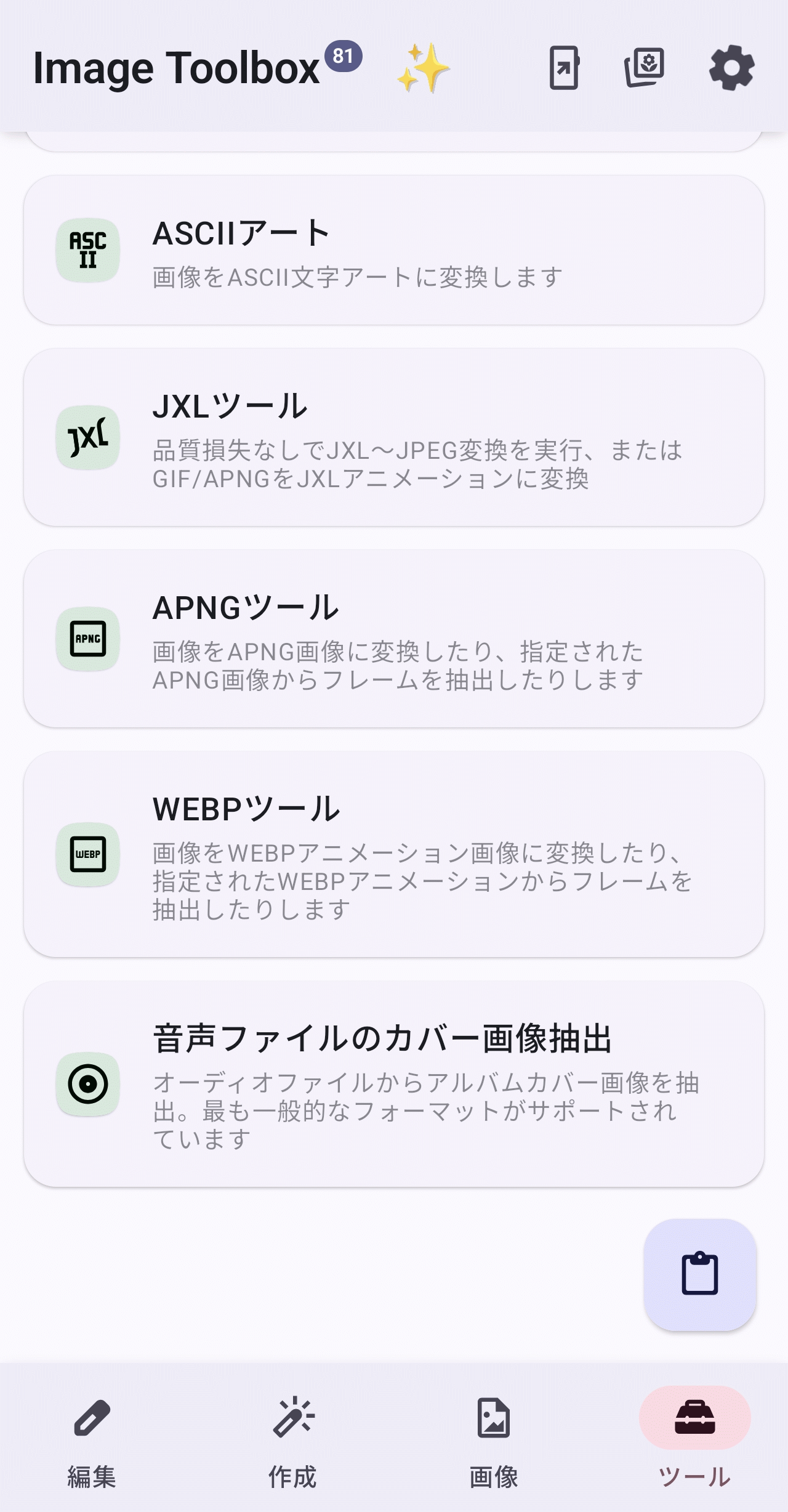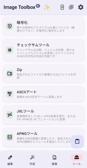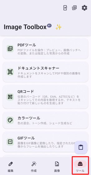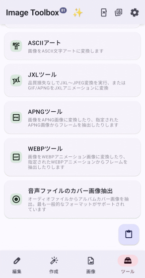 ホーム画面上で「ツール」タブを選択した状態が以下。「PDFツール」「ドキュメントスキャナー」といったPDF関連のツールやQRコードの読み込みだけでなく作成も可能な「QRコード」といったビジネスシーンでも役立ちそうなツールが存在します。また「GIFツール」「JXLツール」「APNGツール」「WEBPツール」といった特定の画像フォーマットをターゲットとするツール群や、変わったところでは「ASCIIアート」を画像から生成するツールや「音声ファイルのカバー画像抽出」といったツールもあり興味が尽きません。