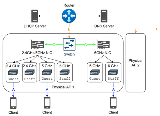 現代のWi-Fiネットワーク構造を模した図が以下。ルーターが物理アクセスポイント(AP)をインターネットやDNS、DHCPに接続しており、1つの機器からAP内部の無線NICとスイッチを通じて、複数の仮想的なSSIDを提供できるようになっています。
