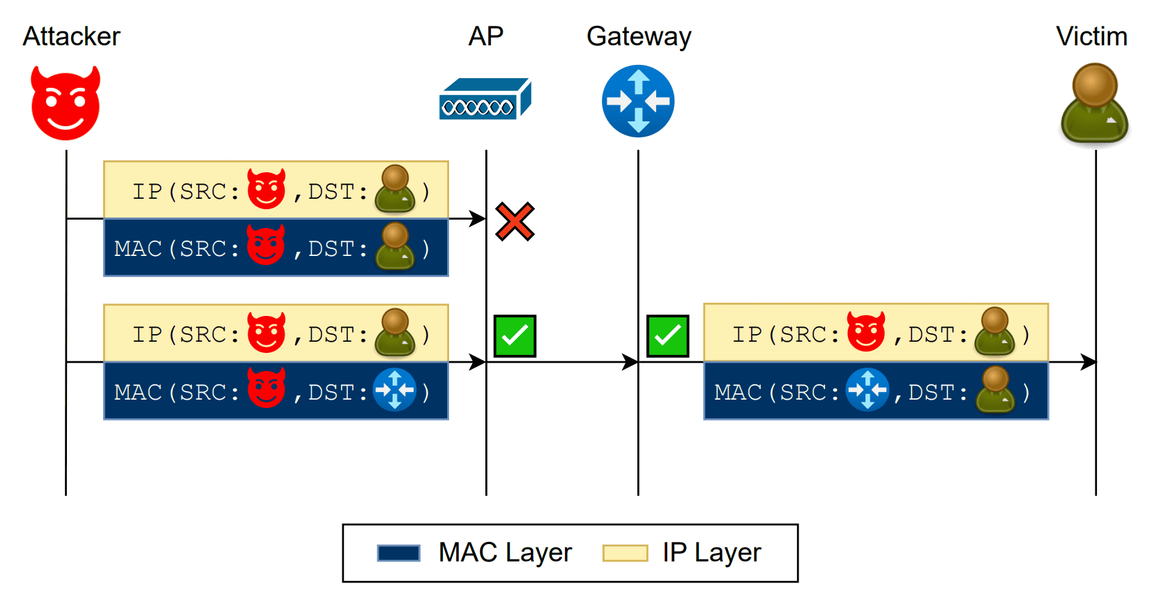 この仕組みを突き、攻撃者はWi-Fiレイヤーの宛先をブロードキャストアドレス(ff:ff:ff:ff:ff:ff)に設定しつつ、IPレイヤーの宛先を特定の被害者に設定したパケットを注入します。検証された全てのオペレーティングシステムにおいて、ブロードキャストパケットの中に含まれるユニキャストIPパケットを処理してしまう仕様があり、これによりクライアント分離をバイパスして被害者に直接パケットを送り込むことが可能となります。