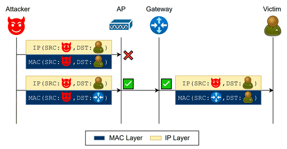 攻撃者は、宛先MACアドレスをルーター(デフォルトゲートウェイ)のものに、宛先IPアドレスを被害者のものに設定したパケットを送信します。アクセスポイントのMAC層での分離機能は、パケットがゲートウェイ宛てであると判断して通信を許可しますが、パケットを受け取ったゲートウェイはIP層でルーティングを行い、結果としてパケットを被害者のクライアントへと転送してしまいます。これにより、直接の通信が遮断されているはずのクライアント間でパケットのやり取りが実現するとのこと。