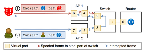 この攻撃では、攻撃者が被害者のMACアドレスを偽装して別のアクセスポイントやBSSIDに接続することで、スイッチ側のマッピングを書き換え、被害者宛てのデータを自身の端末で受信します。一方で、アップリンクでは、攻撃者がネットワークのゲートウェイのMACアドレスを偽装して接続します。これにより、被害者がインターネットへ送信しようとするデータが偽のゲートウェイである攻撃者に送られるようになります。