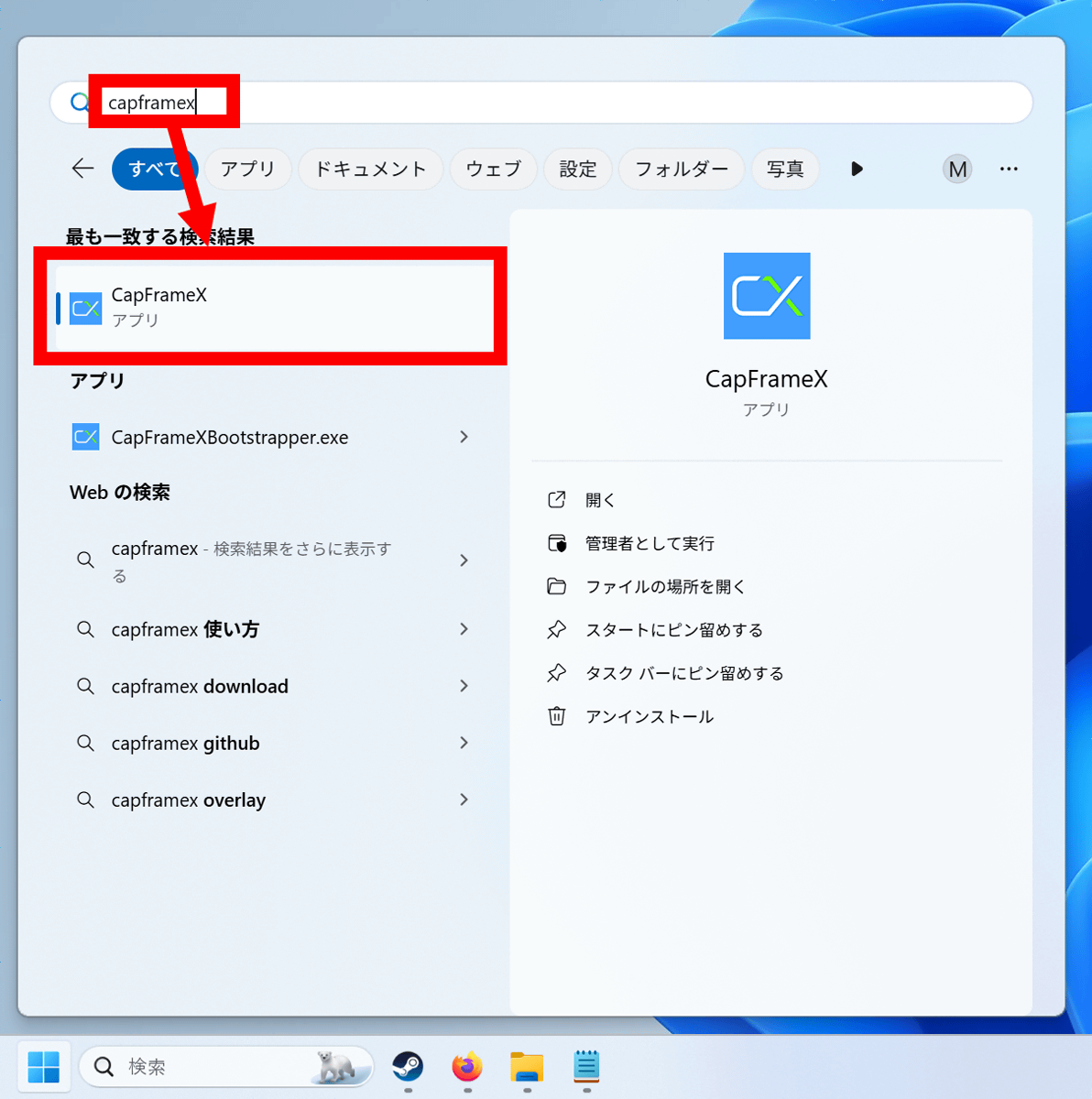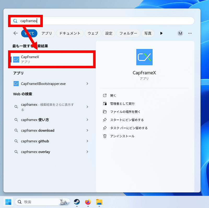 スタートメニューからCapFrameXを探して起動します。