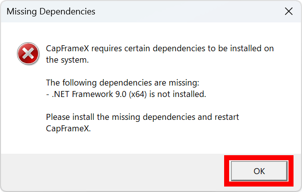 CapFrameXを実行するには.NET Framework 9.0のランタイムが必要です。PCにランタイムをインストールしていない場合は以下の警告が表示されるので「OK」をクリック。