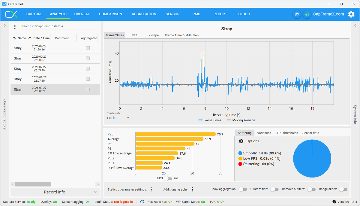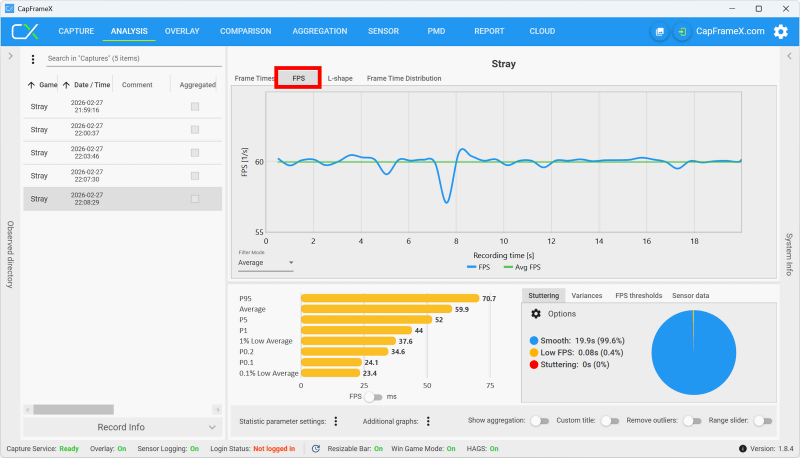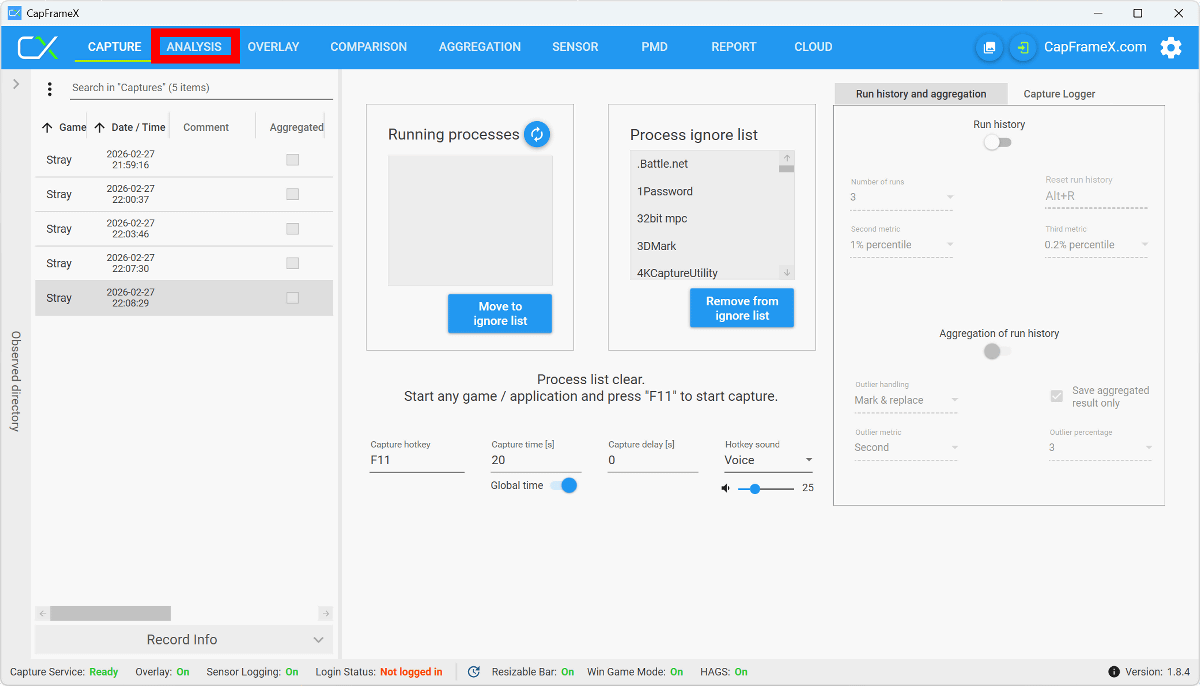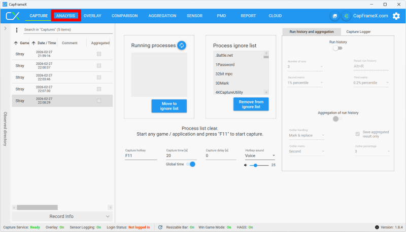 測定完了後にCapFrameXを開くと、画面左側に測定記録が並んでいました。結果を閲覧するには画面上部の「ANALYSIS」をクリック。